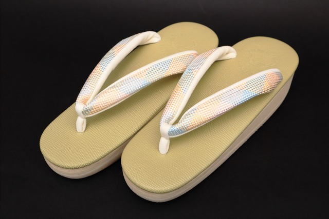 草履「カレンブロッソ組紐鼻緒 カフェ草履」菱屋×渡敬 【サイズ】L(目安24.5〜25.5㎝) 長さ:24.8㎝ 巾:8.4cm かかと高さ:5.9㎝ 【素材】 天の素材:ギアナ(牛革にリザード柄を型押し) 台の素材:EVA(エチレン酢酸ビニルコポリマー) 台の形状:小判型 底の素材:ビブラムソール 【適応年代】お洒落物にてご年齢関係無くお召し頂けます 【お洒落着用】お茶会、パーティー、お出かけ… 【色目】くすんだ絹鼠台、多色 色目につきましてはWEB色見本『日本の伝統色 和色大辞典』を参照しております https://www.colordic.org/w ◆商品説明 菱屋と渡敬コラボ商品になります。 台には軽さとクッション性の高さを兼ね備えた“EVA素材”を採用。 アスファルトやコンクリートなどの生活環境でも歩きやすい実用性に優れた素材。 濡れた路面を歩いた際にも跳ね上げた水滴がなるべく着物の裾をぬらさないよう 踵を斜めにカットするという独自の加工を施しています。 オールシーズンで年齢も問わず、お好みでお履きいただけます。